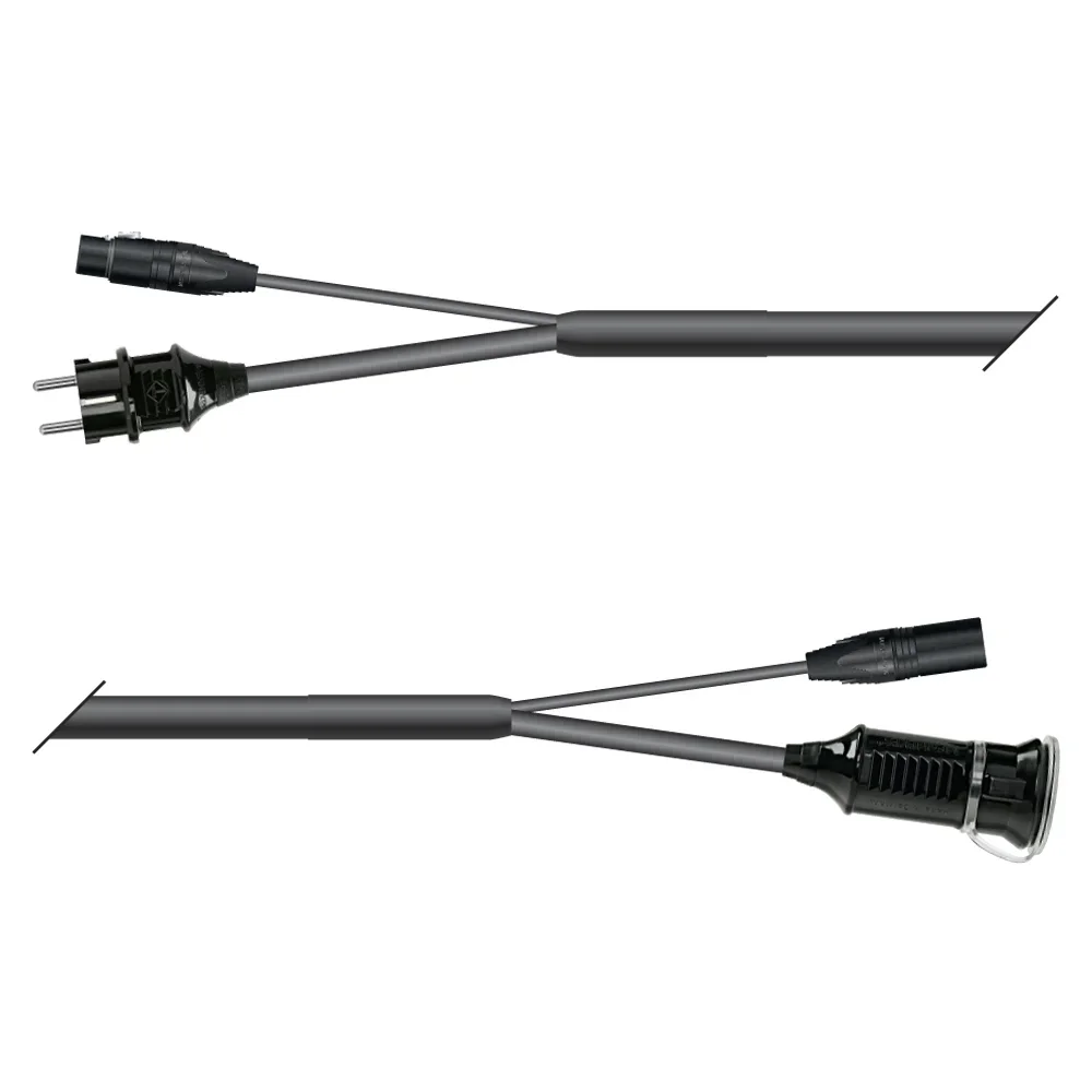 für die einfache Vernetzung von Geräten, die sowohl DMX-Signal, als auch 230 V Netzspannung benötigen (z.B. DMX-Nebelmaschinen, Moving-Lights usw.). Unser digitales DMX512 Multipair-Kombikabel SC-MONOLITH 1 bestücken wir einerseits mit einem MENNEKES Schukostecker bzw. powerCON® Verbinder und einem XLR 3-pol bzw. 5-pol Verbinder von NEUTRIK® – und an der Gegenseite mit einer MENNEKES Schukobuchse, Kaltgerätebuchse bzw. powerCON® NAC3FCB und einem XLR 3-pol bzw. 5-pol Verbinder. Als Bildbeispiele sehen Sie die Versionen MHDC-00/01 und MHDF-00/01. Unsere DMX Kabel besitzen sehr niedrige Kapazitätswerte und eignen sich dadurch auch hervorragend für die Audio- bzw. AES/EBU 110 O-Übertragung.