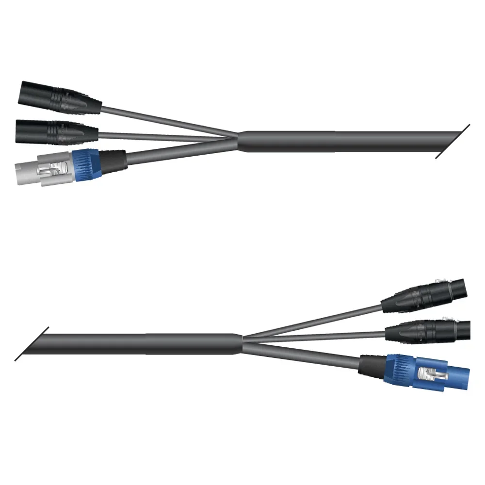 DMX + Netz Multipair Loomsfür die einfache Vernetzung von Geräten, die sowohl DMX-Signal, als auch 230 V Netzspannung benötigen (z.B. DMX-Nebelmaschinen, Moving-Lights usw.). Unser digitales DMX512 Multipair-Kombikabel SC-MONOLITH 1 bestücken wir einerse…