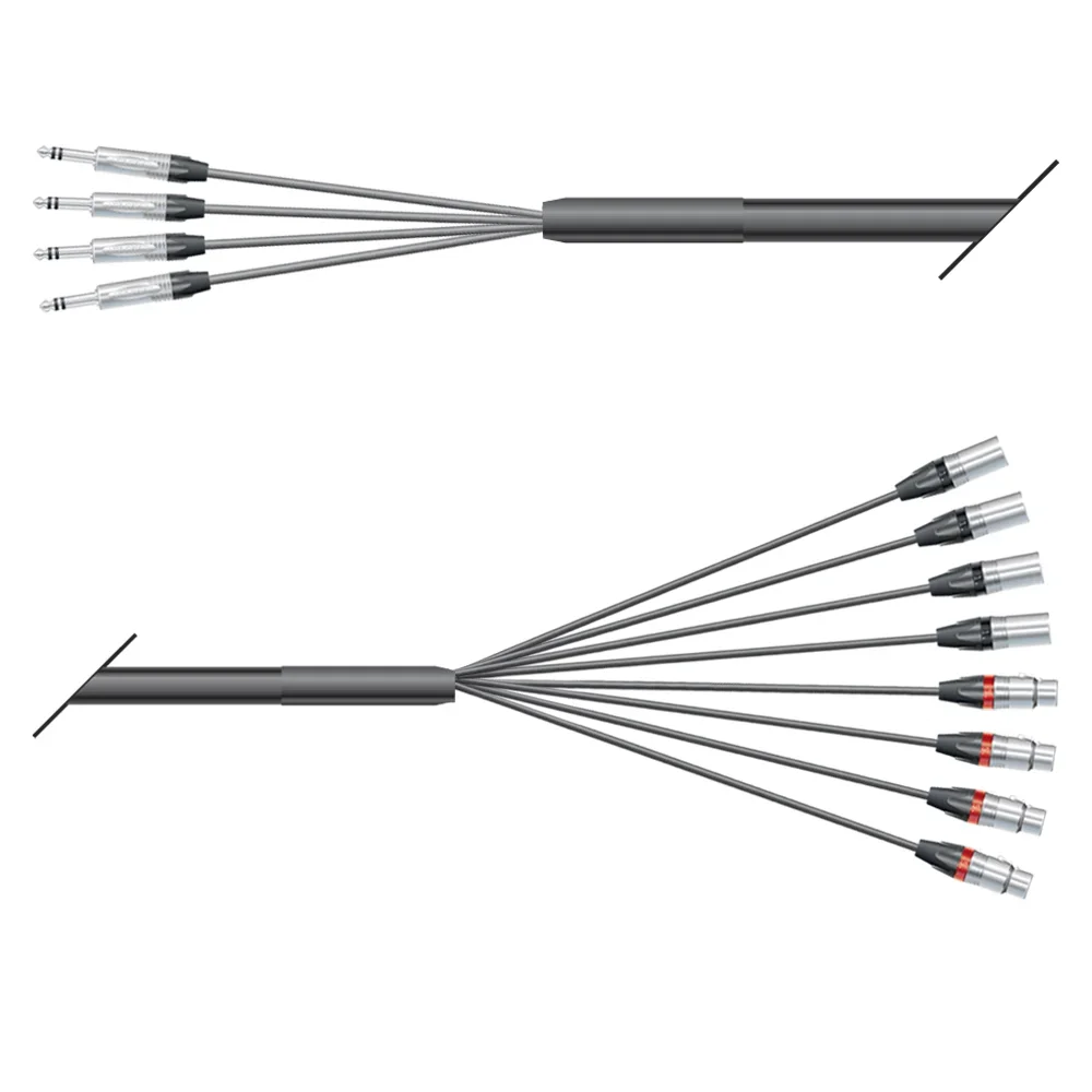 Die folgenden Kabel sind spezielle Insert Looms für Mischpulte mit unsymmetrischen Inserts, d.h. Send und Return sind auf einer gemeinsamen Stereoklinkenbuchse im Mischpult vorhanden. Um diese dann mit einem Effektgerät zu verbinden, muss man das Signal auf 2 einzelne Stecker verteilen. Genau das machen unsere Looms. Dies bedeutet unweigerlich, dass auf einer Seite z.B. 8 Stereoklinken sind, auf der anderen Seiten dann passend dazu 16 Monoklinken. Oder die andere Seite ist mit 8 XLR male und 8 XLR female versehen.