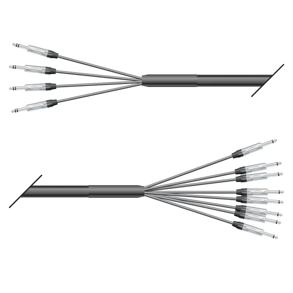 Die folgenden Kabel sind spezielle Insert Looms für Mischpulte mit unsymmetrischen Inserts, d.h. Send und Return sind auf einer gemeinsamen Stereoklinkenbuchse im Mischpult vorhanden. Um diese dann mit einem Effektgerät zu verbinden, muss man das Signal auf 2 einzelne Stecker verteilen. Genau das machen unsere Looms. Dies bedeutet unweigerlich, dass auf einer Seite z.B. 8 Stereoklinken sind, auf der anderen Seiten dann passend dazu 16 Monoklinken. Oder die andere Seite ist mit 8 XLR male und 8 XLR female versehen.