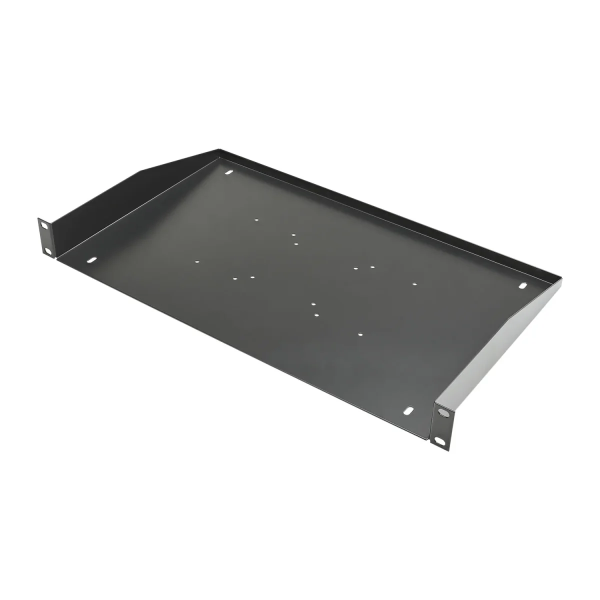 Der 19" Rack-Stellboden mit 270mm Tiefe ist mit vielen universellen Bohrungen zur Fixierung der Geräte ausgestattet. So ist es auch möglich, Geräte die eine geringere Breite als 43 cm besitzen, sicher zu verstauen.