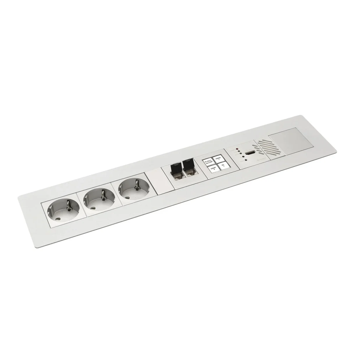 Die Montage erfolgt über einen rechteckigen Ausbruch (397x70 mm) in die Tisch- bzw. Möbeloberfläche - die Klemmwinkel eignen sich für Tischplattenstärken von 10 bis 60 mm. Der modulare Aufbau erlaubt Ihnen jederzeit eine Nachrüstung oder eine Modifikation mit allen marktgängigen 45x45 mm ClipIn-Modulen oder unserer SYSWALL45-Frontplattenserie.