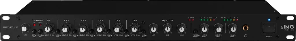 - 6 Stereo-Line-Eingänge, 6 symmetrische Mono-Mikrofon-Eingänge, umschaltbar