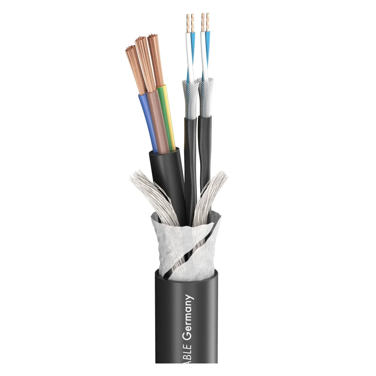 Das SC-Monolith 2 POWER/DMX beinhaltet eine Netzzuleitung mit einem Adernquerschnitt von 3 x 1,50 mm² und zwei DMX 512 Leitungen. Jedes DMX-Adernpaar ist mit einem verzinnten Kupferwendel geschirmt. Zur besseren Unterscheidung wurden beide Adernpaare nummeriert. Die Lastleitung wurde nach VDE konzipiert und als zusätzliche Sicherheit mit einem eigenen PVC-Mantel versehen.