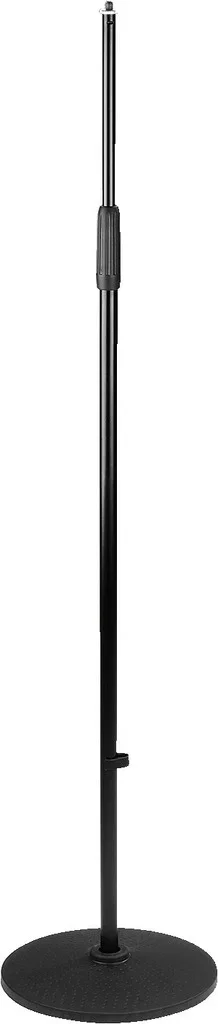 Mikrofon-Bodenstativ, mattschwarz lackiert, mit trittschalldämpfender, schwarzer Guss-Bodenplatte (Ø 25 cm). Sehr stabile, standfeste Ausführung.