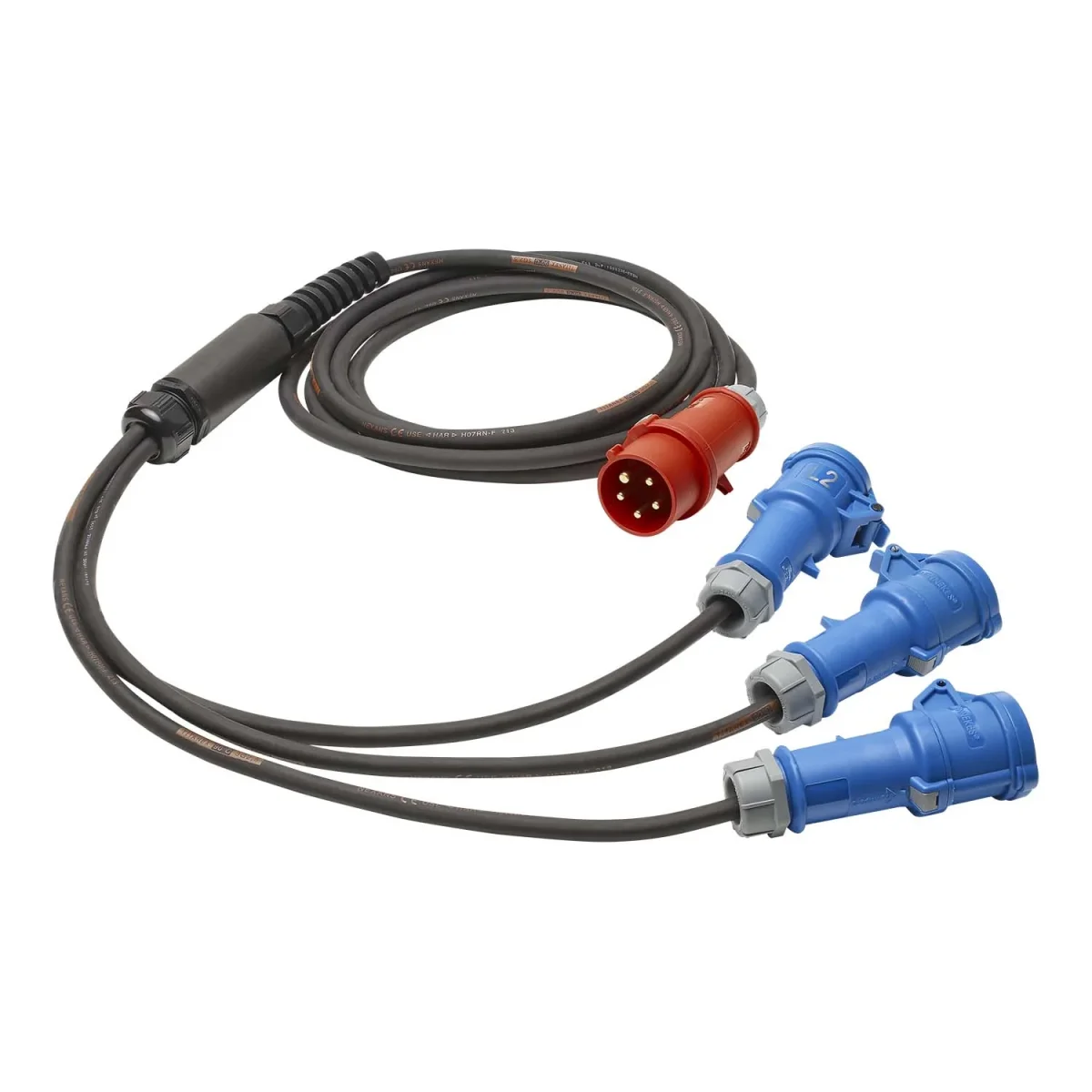 Wir liefern die Last-Verteil-Systeme auf einer Seite mit 5-pol CEE-Kabelstecker von MENNEKES, auf der anderen in verschiedenen Versionen, siehe Tabellen. Als Spleißkabel verwenden wir die Kabelausführung 3 x 2,5 mm².
