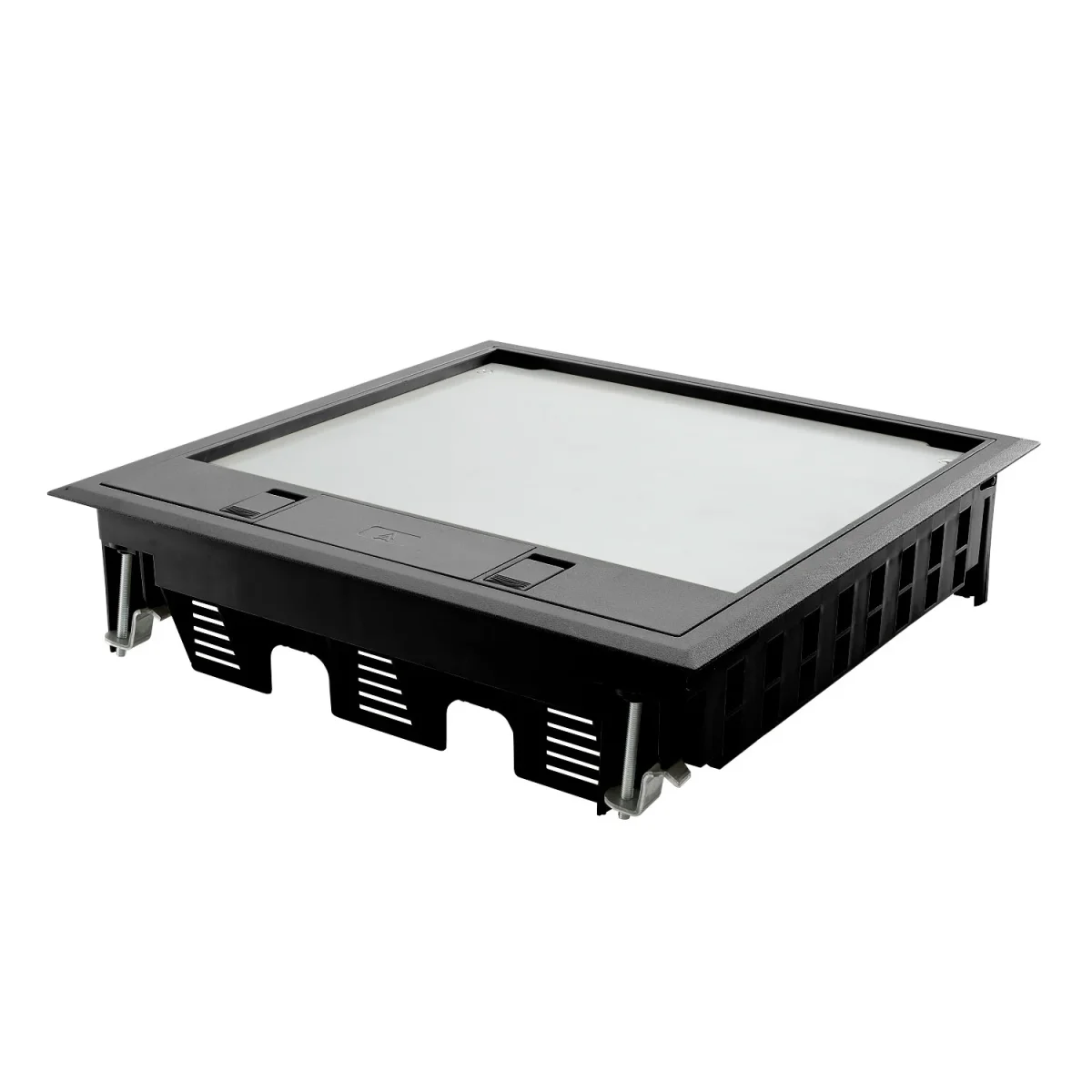 Eckiger Geräteeinsatz aus Polyamid zur Aufnahme von 1 x SYSFLOOR-06 oder max 3 x SYSFLOOR-04 oder 3 Gerätebecher GB3. Für den Einsatz in Kanalsystemen und Doppelböden. Universalbefestigungswinkel einstellbar auf Doppelbodenstärken bis 65 mm. Teppichschutzrahmen, Klappdeckel und Schnurauslass aus Polyamid.