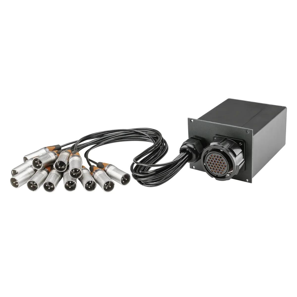 Unterverteilungen mit 8 bzw 12 Kanälen mit Kabelpeitsche zum Patchen auf eine Stagebox. Kabelabgang auf der Vorderseite (3BE) oder auf der Rückseite (2BE). Zur besseren Erkennung der Gruppierung, ist eine Farbcodierung der XLR-Kappen möglich.