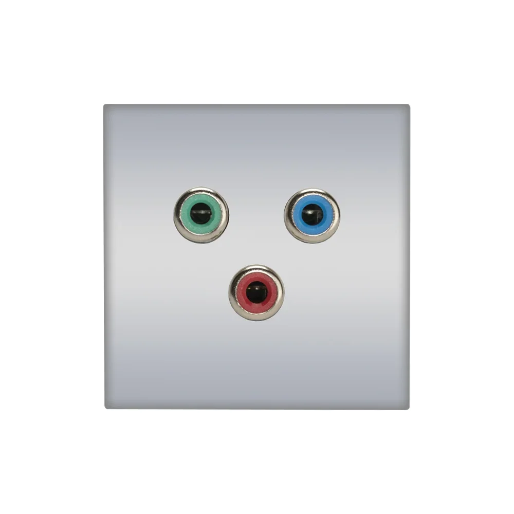 SYSWALL45 Cinch RGB -> KlemmblockPlatte: 45x45mm Clip-IN-TechnikFarbe: silber lackiert ---------------------------------Anschlüsse Vorderseite:3x Cinch female (rot, grün, blau)---------------------------------Anschlüsse Rückseite:1x 6fach Aufzugs-Kle…