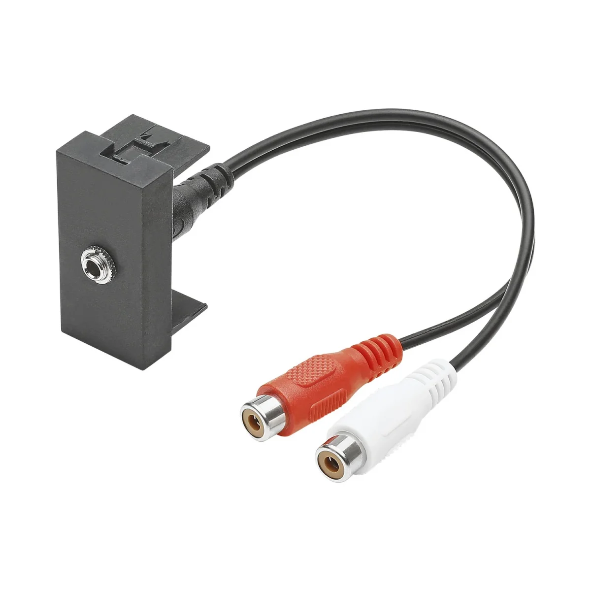 SYSWALL45 Miniklinke St. -> KabelbuchsenPlatte: 22,5x45mm Clip-IN-TechnikFarbe: schwarz matt---------------------------------Anschlüsse Vorderseite:1x 3,5mm Klinkenbuchse Stereo---------------------------------Anschlüsse Rückseite:2x Cinch-Kabelbuchs…