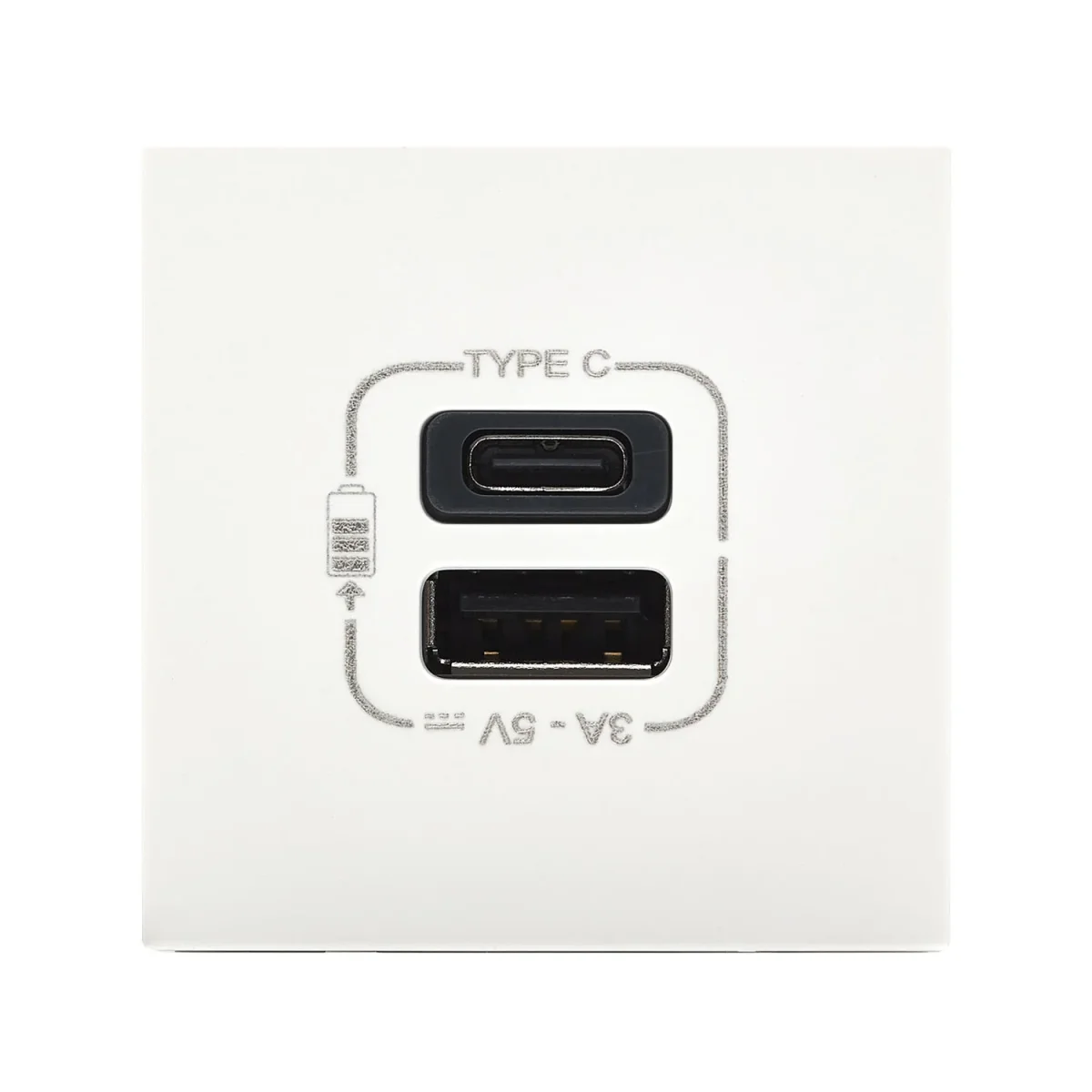 SYSWALL45 USB-Lademodul A/C, 3APlatte: 45x45mm Clip-IN-TechnikFarbe: weiß hochglänzend--------------------------------------Anschlüsse: USB-B Type A + CLadeleistung: max. 15 Watt
